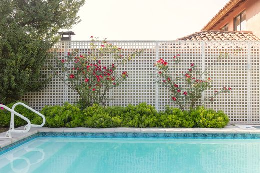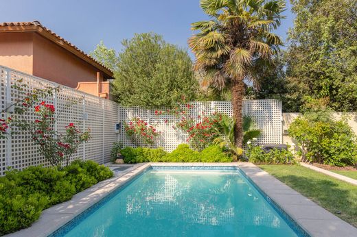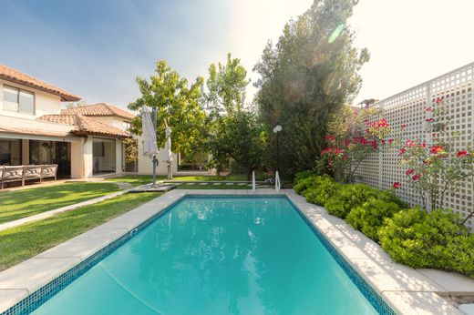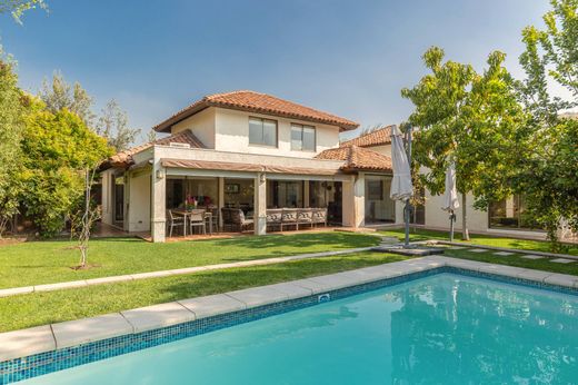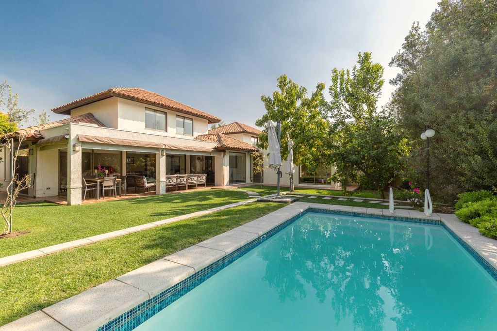 This Chilena-style house in the condominium is well-maintained and not on the perimeter. It features a terrace and a heated pool. First floor: - Entrance hall - Living and dining room with access to a covered terrace - Guest bathroom - Furnished kitchen with oven, hood, stove, and breakfast area. Granite countertops. - Extension near the kitchen that can be used as a family room or office - Master bedroom en suite with a spacious walk-in closet (originally a study) - Service bedroom - Closed laundry area Second floor: - Family room - Two equally-sized bedrooms - Bathroom The landscaped garden has automatic irrigation, mature plants and trees, a 6x3 m pool with a heat pump, and a covered terrace. There's also an outdoor 3x3 m storage room. Parking for two cars with an automatic gate. Gas central heating through radiators, and air conditioning in the family room, living room, and master bedroom. Common expenses: $115,000.- Property taxes: $340,000.-
