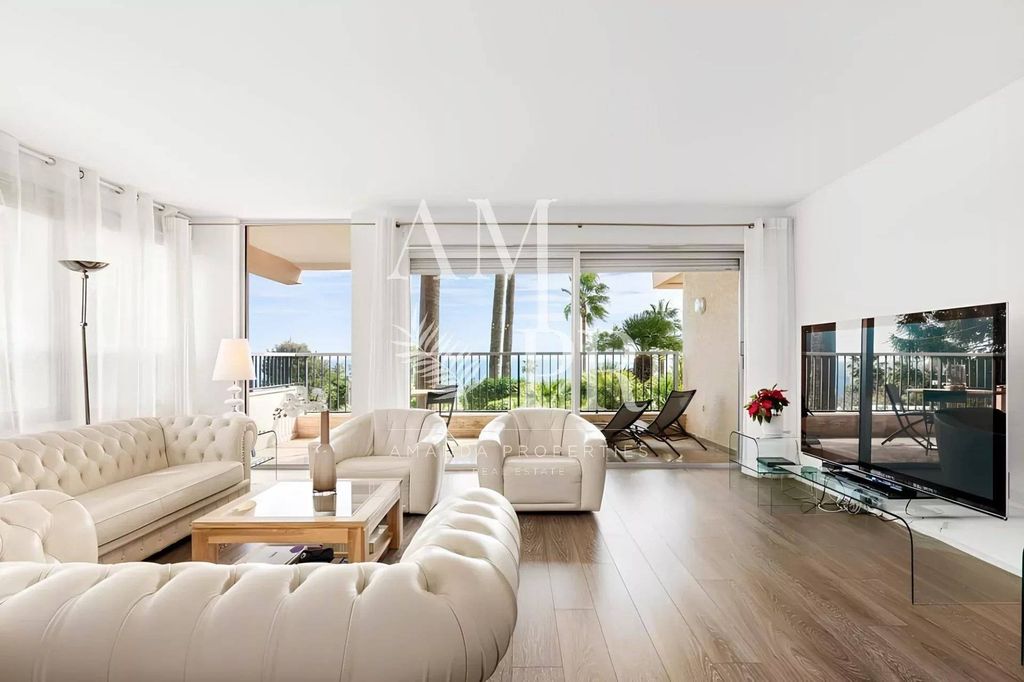 It consists of an entrance, corridors with storage cupboards, a separate high-end kitchen, fully equipped of approximately 14 m², a pantry/laundry room, a large living room-dining room with 'approximately 70 m² very bright and opening onto a terrace of approximately 14 m² facing south with a sea view of the Lérins Islands.