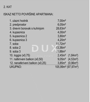 Beautiful apartment for sale in Novalja on the island of Pag. The apartment is located on the second floor of a residential building. It consists of: entrance hall, vestibule, living room with kitchen, 2 bathrooms, 3 bedrooms, loggia, 2 covered balconies, 1 parking space. Total net area: 104.14m2. Total gross area: 130.36m2. It is an attractive location with a wonderful view of the sea, just a few minutes from the beach. Quality new construction of modern architecture. High-quality PVC joinery with three-layer glass, mosquito nets and electric aluminum blinds. Underfloor heating has been installed in all rooms, as well as air conditioning for heating and cooling in the bedrooms and living room. First-class sanitation, burglar-proof entrance door. Ready to move into in the 5th month of 2024. The real estate is in the VAT system (legal entity) and the buyer does not pay real estate sales tax. Dear clients, the agency commission is charged in accordance with the General Business Conditions www.dux-nekretnine.hr/opci-uvjeti-poslovanja