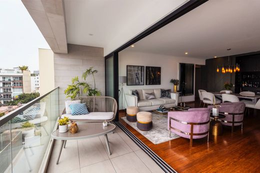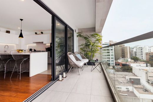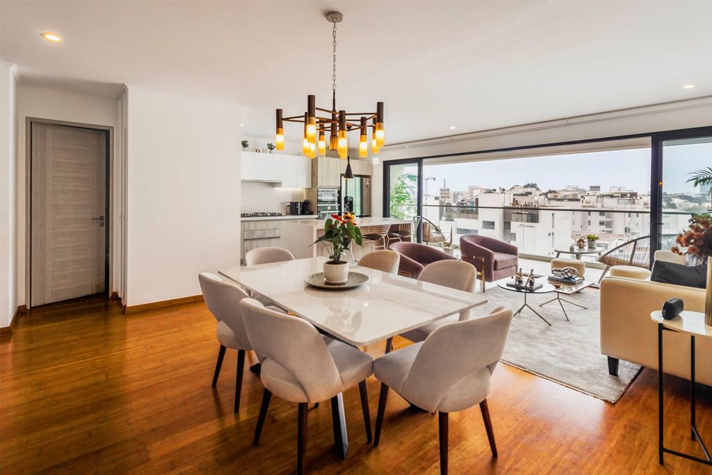Exclusive two year old Penthouse in front of a park, located in an excellent area in Miraflores, a few blocks from Dasso, Comandante Espinar, Santa Cruz, Angamos, Ovalo Gutierrez, very close to cafes, banks, schools (Inmaculada Corazón, San Silvetre, Maria Reina , among others), Clinics, Supermarkets, Restaurants, Gyms. Fine and modern lobby. The Department has good lighting, the finishes are first class: thermoacoustic windows and screens, structured wooden floors in social and private areas, quartz boards in the kitchen, oven, countertop, microwave, Bosch built-in hood and dishwasher, showers. Spanish, all Kohler brand taps, quartz panels in the bathrooms. First level : Entrance hall that leads to a large dining room with open kitchen, large bar, guest bathroom, terrace. On the first level there is also the master bedroom with a bathroom and walk in closet, 2 bedrooms, one with a closet and the other with a walk in closet that share a full bathroom and linen closet, Second level: Fourth bedroom with closet, full bathroom. Large spacious living room and a large terrace with BBQ with built-in kamado, large dining room on the terrace. Complete service area. Building has Calidda gas, It includes three garages in the basement of the Lord Cochrane Building and a storage room. The property is surrounded by beautiful parks and gardens. 24 hour surveillance, security camera system Parking for bicycles Pets accepted Age: 2 years