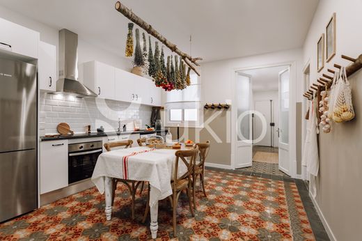 The gorgeous living room has traditional Catalan tiled floors, which are present throughout the apartment, that help add a pop of color to the space. The doors open up to a small balcony for sitting, and they allow air to circulate while relaxing on the couch during the warmer months. The modern kitchen is complete not only with all appliances, but also utensils, and has a rustic table for enjoying a home cooked meal.