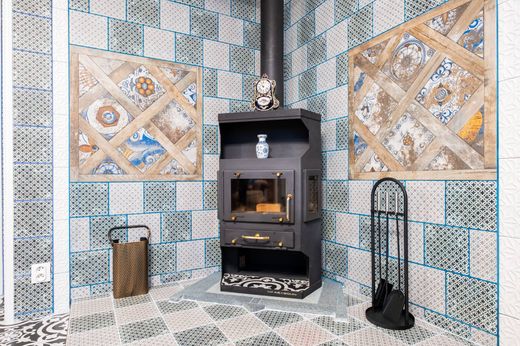 There is a wood-burning stove with fireplace in the living room.