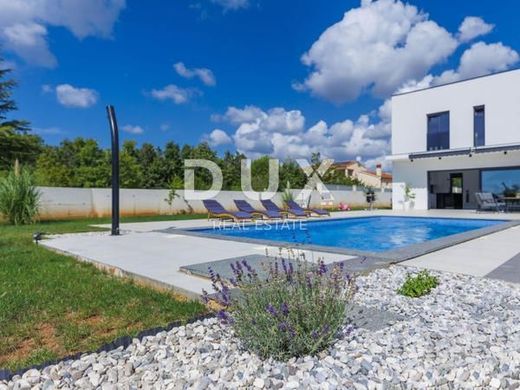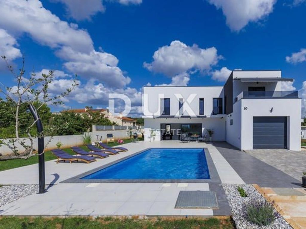 Not far from the town of Vodnjan, there is a small town called Majmajola, which is rich in family houses and top quality holiday villas. Our agency offers exactly one of these. It is a villa of modern construction located on a plot of land of 666m2, while the living space is 174m2 and extends through the ground floor and the first floor. On the ground floor there is an entrance hall, a spacious living room connected to the kitchen and dining room, a bathroom with a toilet and a storage room. The living room is illuminated thanks to the Rehau glass wall, which provides direct communication with the spacious outdoor terrace and access to the pool and sunbathing area. The internal staircase leads to the first floor where there are three bedrooms. The two bedrooms each have their own wardrobes and share a spacious and modern bathroom. The third bedroom, the master bedroom, has its own wardrobe, bathroom with toilet and a spacious balcony. The heating and cooling of the property is solved through the ventilation ducts of the central floor system powered by Mitsubishi machines that reach the desired temperature in just a few minutes. The interior of the property was made to measure, and the interior designer is responsible for it. The floor coverings, marble and ceramics, are first class and Mapei materials are used, while all the carpentry is Rehau brand with double and triple glass. There is a 4x8 swimming pool on the 492m2 plot, decorated with ceramic mosaics and epoxy joints, fully automated and includes counter-current swimming. The garage has direct communication with the villa and is intended for one vehicle, while there is space for 5 additional cars in the outdoor parking lot. Considering the location and the arrangement and the quality of the property, we believe that the villa is highly recommended and is ideal for a wonderful family life in a quiet location or for a safe return on investment through rental for tourist purposes. Feel free to contact us for any additional information!