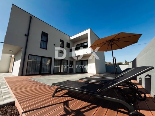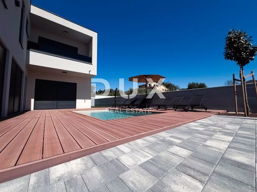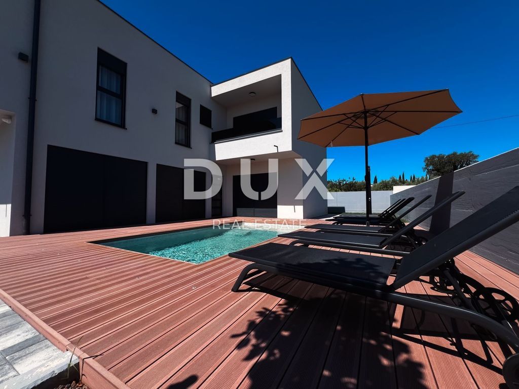 A modern semi-detached house with a swimming pool of 228m2 is for sale right in Pomer. The house consists of two floors. On the ground floor there is a hallway, one bedroom with bathroom, toilet, living room with dining room and kitchen in one part, and a terrace that opens onto a 20m2 pool. Upstairs are two more bedrooms, each with its own bathroom and terrace. Excellent location, quality modern construction, straight lines. It is possible to park 3 cars in the yard of the property. The property is ideal either for a summer vacation or for year-round living. The property is located in a quiet bay near ACI Marina Pomer and 20 minutes' walk from the first beaches. Close to Medulin and the center of Pula, as well as the Pula airport, about 15 minutes' drive away.