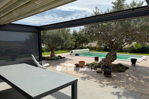 Beautiful contemporary villa of approximately 190 m2, on one level, functional and very bright on an enclosed plot of 1000 m2 in a very residential area on the outskirts close to the city. The villa offers a large living room of 60 m2 with high-end Italian equipped kitchen, a Focus fireplace for your winter evenings, a large living room opening onto a large terrace with electric bioclimatic cover and side blinds for your summer meals. A spacious scullery for cooking or storage. A master suite with shower room and toilet. A huge dressing room, a large laundry room that can be transformed into an additional bedroom. The particularity is found in the organization of the 2 other bedrooms, each with bathroom and toilet which forms an independent part of the house but which can be connected by a corridor if necessary. Ideal for teenagers and friends.... A beautiful swimming pool with its beach and olive trees in the garden offers a holiday feel. Bowling alley. Covered space that can be closed to park 2 vehicles. Double car entrance each with automatic gate to park several vehicles or camper vans