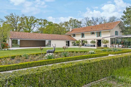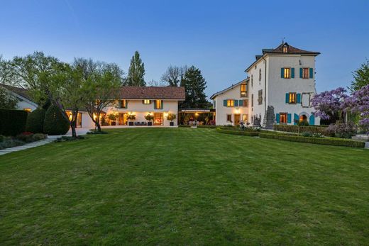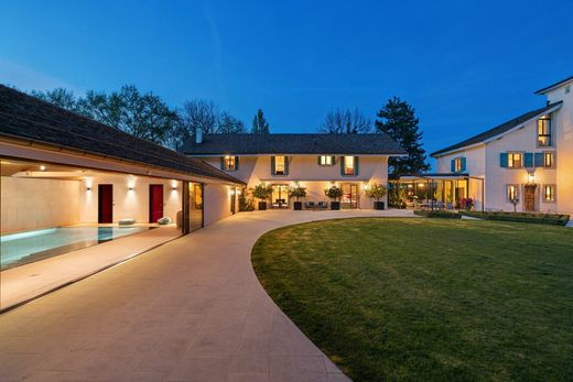 Located in the heart of the peaceful Geneva countryside, in the charming commune of Choulex, this magnificent estate, bathed in light and nestled on a plot of around 5,000 m2, will offer you an exceptional living environment. Composed of several buildings, including an 18th-century fortified house, the property has been entirely renovated in 2010 using the highest quality materials. The property skilfully blends modernity and authenticity. It features generous reception areas including a splendid dining room, several offices, linked by a magnificent glass roof. All served by an elevator. The sleeping area comprises a master bedroom, with two dressing rooms (Mr. and Mrs.) and two full bathrooms (Mr. and Mrs.), which occupies an entire floor; 6 other bedrooms with en suite bathrooms. A janitor's cottage, offering two additional bedrooms, completes this ensemble. You'll be enchanted by the former stable converted into an indoor swimming pool, as well as by the magnificently wooded park of around 4'400 m2, preserving the peace and privacy of the property. An adjoining orchard of 1'000 m2, home to apple, pear and other fruit trees, enhances this exceptional setting. A double garage and 6 outdoor parking spaces complete this sumptuous property