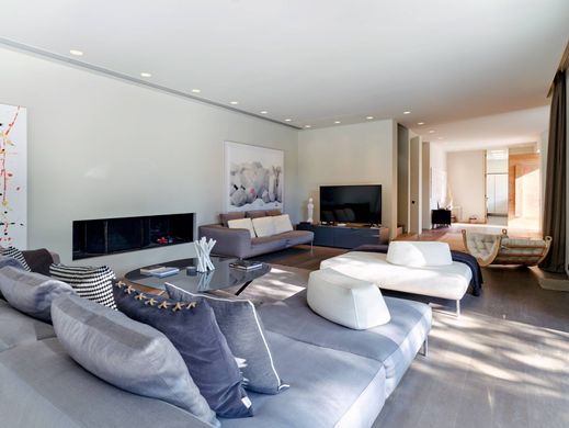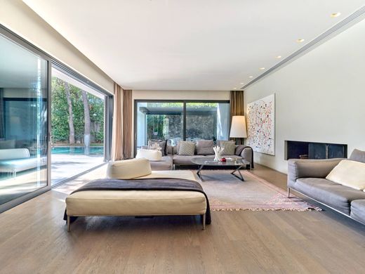 On the first and second floors, the main residence spans 450 sqm, boasting a private garden and swimming pool for relaxation. The first level includes a large living and dining area connected to the garden and pool, as well as a separate kitchen with Gaggenau appliances.