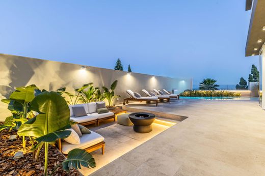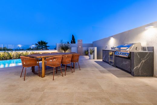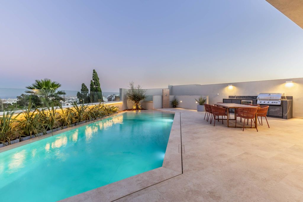 Presenting a stunning semi-detached villa nestled within an upmarket villa area, this property combines elegance, functionality, and convenience. Boasting high standards of finishing and furnishing, stylish decor, and an abundance of natural light, this residence offers a spacious layout. Upon entering the welcoming entrance hall you will find a wood burning fireplace, creating a warm and inviting ambiance. The ground floor encompasses a TV, cinema room, a generously sized kitchen, a breakfast area, and a dining, lounge area. This open-plan space seamlessly flows onto the outdoor area, which features a swimming pool and a delightful outdoor setting, complete with a fire pit and perfect for entertaining guests, either for al fresco dining or sun lounging, whilst enjoying the lovely open views. On the first floor, you will find three double bedrooms, each complete with its own en-suite bathroom. The main bedroom stands out with its breathtaking open views, a large terrace, and a convenient walk in wardrobe. The second floor offers a versatile space that can serve as either a fourth bedroom or a home office. This room is complete with an en-suite bathroom and complemented by front and back terraces, where one can enjoy the lovely views. The basement level of the property is thoughtfully designed to provide luxurious amenities. It includes a shower and bathroom dedicated to the swimming pool area, a sauna, an indoor jacuzzi, and a gym. Additionally, a separate flatlet comprises two bedrooms, a bathroom, and a living/kitchenette area, offering a private retreat for guests or additional family members. Convenience is enhanced with the inclusion of a lift that connects all levels, from basement to roof. Furthermore, all rooms are equipped with air conditioning to ensure optimal comfort year-round. Completing the package is an interconnecting two-car garage, providing secure parking and easy access to the property. Properties of this caliber and distinction are rare to find, making viewings highly recommended.