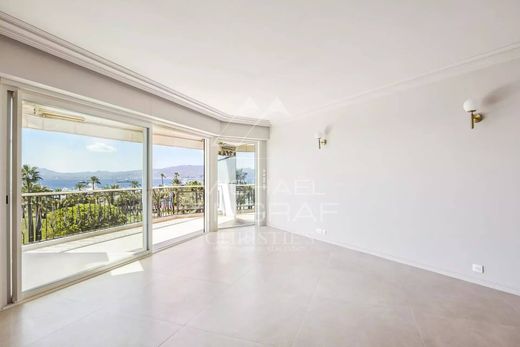 In a prestigious building on the Croisette facing Port Canto, very attractive and light-filled 95 m² flat, on a high floor with panoramic sea views. It comprises a living/dining room opening onto a lovely west-facing terrace, an independent fitted kitchen, a master bedroom with dressing room and en suite bathroom, and a second bedroom with shower room.