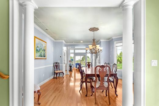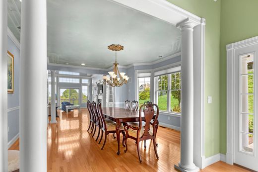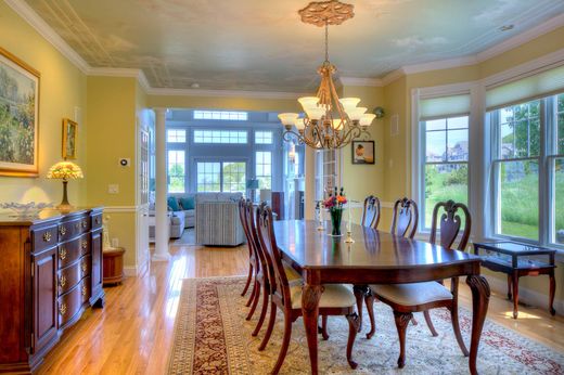 Experience the epitome of luxury living with breathtaking views; Nestled at the end of a culdesac at the waters edge, this end unit is well built and meticulously maintained by the original owners. Upon entering you are greeted by the elegance of this well designed home and have everything you need for one level living. Features include large office/ den with french doors and access to side grilling patio, generous formal dining room, two story living room with floor to ceiling water facing windows open to gourmet kitchen. Enjoy the ever changing dramatic sunsets from the expansive deck (with new composite decking) covering the entire width of the home. Main level ensuite primary bedroom has 2 generous closets and back deck to bring in the morning light. Upper level offers an open den, luxurious second primary en-suite with Brazilian cherry floors, barreled ceiling and 2 walk in closets. Entertain with ease in the finished lower level with home theatre, family room with gas fireplace, billard area, guest bedroom and full bath. Oversized walkout custom patio built from stone native to the villages property completes the lower level. The positioning of this home within the villages is one of the most private, with a grassy hill to your east, expansive lawn to your west and nothing but nature to look at and enjoy. Gated 55+ Community with pool, fitness, tennis, pickle ball, water access and community activities short drive to area beaches, Bristol, Newport and Providence.