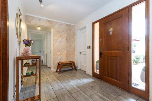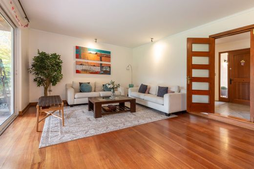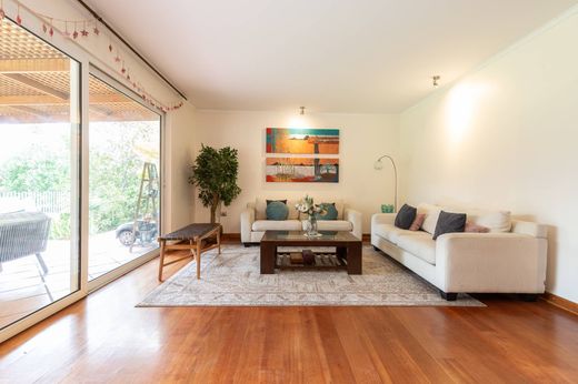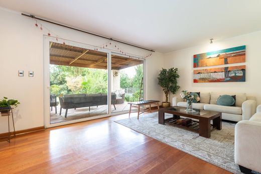 Two-story Chilean-style house. First floor: - Entrance hall. - Guest bathroom. - Separate living and dining rooms with access to a covered terrace. - Fully equipped kitchen with breakfast area, electric oven, gas hob, and extractor hood. - Master bedroom en suite with access to the terrace and walk-in closet. Second floor: - Family room. - 3 bedrooms with closets. - 2 full bathrooms. Exterior: - Swimming pool. - Covered terrace. - Barbecue area. - Established garden. - Automatic irrigation system. Services: - Maid's bedroom and bathroom. - Covered laundry area. Finishes: - Floors: Porcelain ceramic tiles in the entrance hall. - Laminate flooring in living, dining, and bedrooms. - Bathrooms with ceramic tiles, and marble sink countertops. - Underfloor radiant heating. - Windows with double glazing.