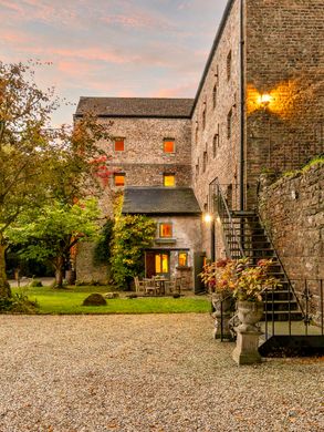 An attractive and exquisite home sympathetically set within the fabric of an historic corn mill and magically situated within private grounds on the banks of the river Liffey and including the original cascading mill race canal. In all about 3 acres (1.2 hectares) and extending to 6,900 square feet or 641 square metres of accommodation with 5 Bedrooms and 4 Bathrooms. With the resplendent red brick exterior stretching up to four and five floors and abutting the cascading mill wheel canal The Old Mill is enchanting and extremely picturesque. The restoration and conversion of the building into a home magically marries the rare original industrial charm with contemporary living requirements, to create an utterly enticing and fun home. The unashamedly industrial themed interior incorporates well thought out living spaces punctuated with original millstones, corn elevator shafts, massive ceiling beams, rustic timber staircases and ladders, white-washed walls and varying ceiling heights to alluring effect. A flagged stone reception hall retains the original corn milling wheels behind a glass wall and features the rustic mill staircase to the upper floors and leads to a study, an office, a spacious bathroom with a large bath, a shower and a sauna and two bedrooms, one with a hobbit like door to an enclosed walled garden. The first floor has a large open plan kitchen with a fully fitted kitchen, large breakfast counter worktop, industrial themed lighting and incorporating original mill fittings and equipment to great effect. It leads to a fine living room with a large cast iron stove and used as a dining and television space, off the kitchen there is a large pantry. The second floor has an incredible double height studio space with an evocative mix of tall, white-washed walls and exposed timber beams and boards and, again, incorporating original mill components. A large cast iron stove ample warms the space and there are two stairs to an upper mezzanine library floor. Itself opening onto the third-floor landing, which leads to the marvellously generous master bedroom suite with a large bedroom and interconnecting shower room and dressing room. There are two further bedrooms (on the second floor) one with a shower room ensuite and the other served by a second shower room on the landing hall. The final fifth or attic floor was previously utilised as an art studio space and is currently used as a gym and store. Bounding the river Liffey and including a fine riverbank stretch, one part opening into a natural river swimming hole or pool, the gardens are well-timbered and private. A striking cut-stone aqueduct bridge, Victoria Bridge, dates to 1837 and forms a great folly backdrop to the gardens. An original wrought iron bridge beside the impressive and large timber mill wheel leads to the gardens, abundant with wildlife and having an island like feel, being bounded by the canal and river. Although usefully also be accessed by vehicular gate. The mill wheel is thought capable of generating 3kw of electricity per hour, or more, in a recent appraisal. Historically and architecturally significant The Old Mill has a rare magical quality and retains much of the original industrial mill equipment makes a truly unique and enchanting home. Milling activity on the grounds is thought to date back to the 14th-century. The current mill is largely late Georgian, circa 1810, in composition but likely incorporates earlier structures. A mill illustrated on maps back to 1654 in the mid-17th-century. Yeomanstown is a highly fashionable area and links easily to Dublin city and airport. The nearby village of Caragh is quaint and includes a school, petrol station, grocery store, take-away restaurants and a hair salon. Naas town is just 7.7miles miles or 12.3km away and has a hospital and array of shopping, pubs, eateries, and restaurants. Sallins village, just a 12-minute drive away, provides train access with extensive commuter services into Dublin city.