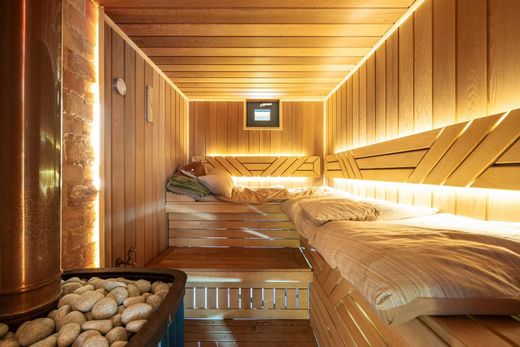 From the moment you arrive, you will be charmed by the elegance and sophistication of this chalet. The spacious outdoor terrace, approximately 80m², invites you to enjoy moments of relaxation in the open air, with a stunning backdrop of the surrounding mountains. Inside, you will discover an indoor pool, perfect for relaxing swims year-round, as well as a traditional Finnish sauna, ideal for unwinding after a day on the slopes.