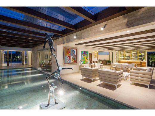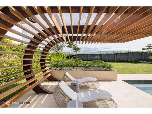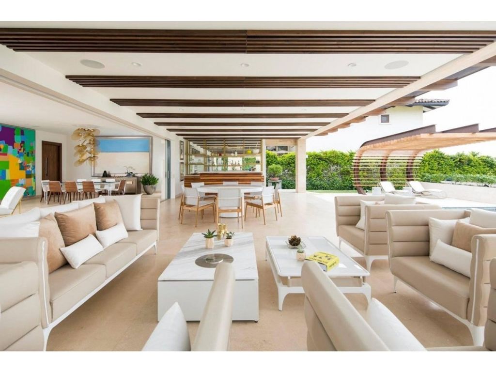 Casa Matisse, La Hacienda, Santa Ana (AD) Warm contemporary style for luxury living in La Hacienda. Casa Matisse is a stunning residence that fuses elegance and functionality in a contemporary setting. With spacious living spaces and semi-integrated areas designed for entertaining, this property stands out for its social area that blurs the boundaries between indoor and outdoor living. Enjoy a charming terrace, a deck, and a heated pool in an environment that combines comfort and sophistication. Casa Matisse features refined details, including marble floors, almond wood, and cedar finishes. Situated in an excellent location within La Hacienda in Santa Ana, the home benefits from gated access, triple-level security, and impeccable infrastructure with cobblestone pathways. It is located on the west side of San Jose, Costa Rica, offering a wide variety of amenities. The main entrance of Casa Matisse impresses as it frames the majestic welcome towards the pool and entertainment area. Upon entering, the view opens to a large social area that extends from the terrace to the pool and gardens, double-height ceilings creating a warm and contemporary atmosphere. The social area of the house includes an integrated dining and living room, which merge with the gardens and open the space to the terrace. This area is ideal for events and family gatherings, with an integrated audio system and high ceilings enhancing its spaciousness. The terrace connects to the heated pool and landscaped gardens through a natural stone frame and wooden beams. The spacious kitchen at Casa Matisse is designed around a central island with quartz countertops and a preparation sink, ideal for food lovers and for large gatherings. Equipped with high-end appliances and a large pantry, the kitchen integrates into a breakfast area with a window offering refreshing views of the garden. The staircase leads to the upper floor and the private area of La Casa Matisse. A large family room serves as the heart of the house, with large windows allowing an abundant influx of natural light. The private rooms include three secondary bedrooms with a walking closet each and its own full bathroom. The master suite has its own living room and a view of the garden. Its bathroom offers a jacuzzi, double sinks, and a walking closet. The garage has space for four cars, with outdoor space for more vehicles. In addition, the property has a service room and area. 2023 m2 of land 978 m2 of construction 4 bedrooms 5 full bathrooms 1 half bathroom 4 covered garages Sale price $4,500,000