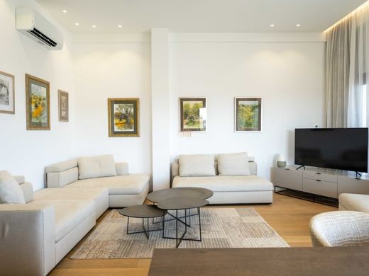 The residence has been custom-designed using high-end materials, merging two two-bedroom apartments into one expansive living space. Each room is generously sized, boasting ceilings that reach 3.70 meters in height. Amenities include underfloor heating, Mitsubishi air conditioning, a water filtration system, and an Italian kitchen by Ernesto Meda, equipped with Miele and Gaggenau appliances. The apartment features wooden flooring, Italian frameless doors, and premium sanitary ware from Antonio Luppi, Villeroy & Boch, and Grohe. Additionally, there is a laundry room complete with a washing machine and dryer.