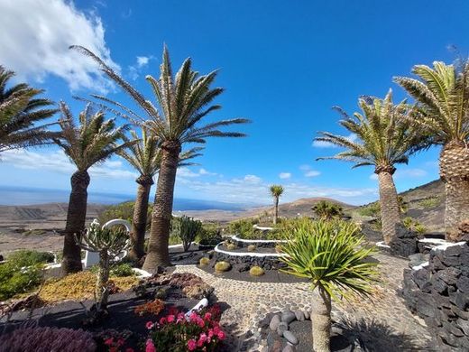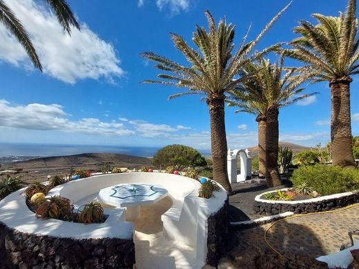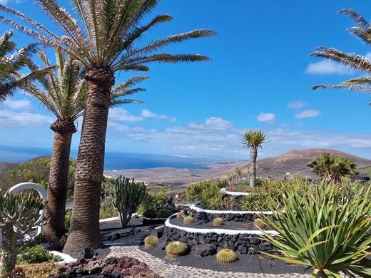 Lush and luxurious 750 m² house built in a green oasis on the slope of a volcano on a 41,337 m² plot. The house is spread over 4 levels with a stunning view of the ocean towards Fuerteventura. The main house consists of 3 bedrooms, 4 bathrooms (3 en suite), living and dining room with open kitchen with central island, large office, indoor and heated pool, two gas fireplaces, laundry room with ample storage space, covered garage for two cars and wine cellar for wine lovers. In addition, you will find 4 completely independent apartments, 2 of them with jacuzzi, each consisting of a bedroom, bathroom, kitchen and private terrace. The extensive and well-kept garden allows complete privacy. Alarm system and video surveillance. Currently, the house is used for tourist rentals. Do not miss this unique opportunity in the heart of Lanzarote.
