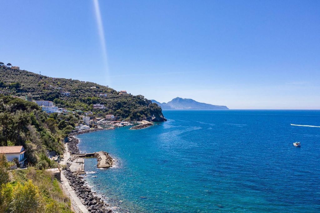 From its top, it overviews a breathtaking picture over its typical crystal blue coastline, the bay of Naples, Sorrento and Capri. This prestigious villa offers plenty of inner space and large terraces.