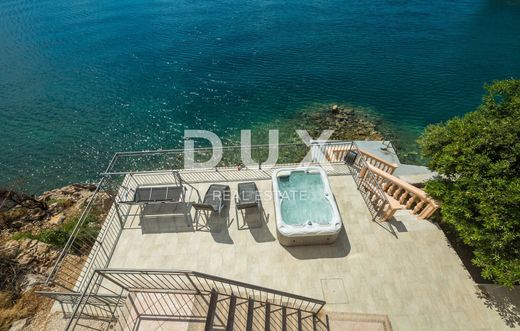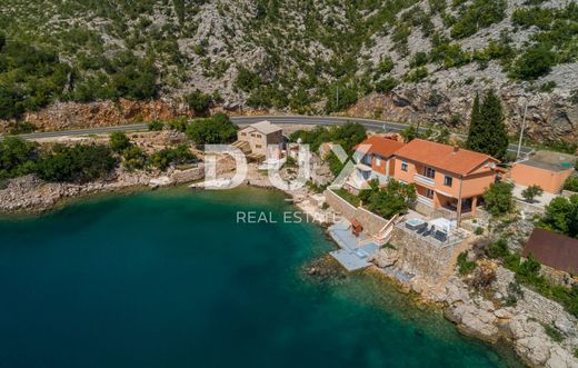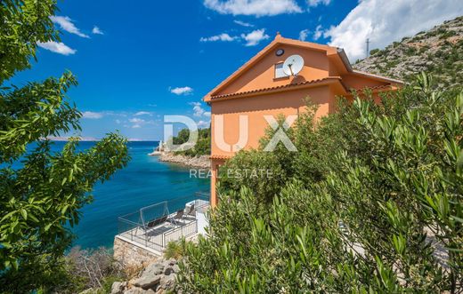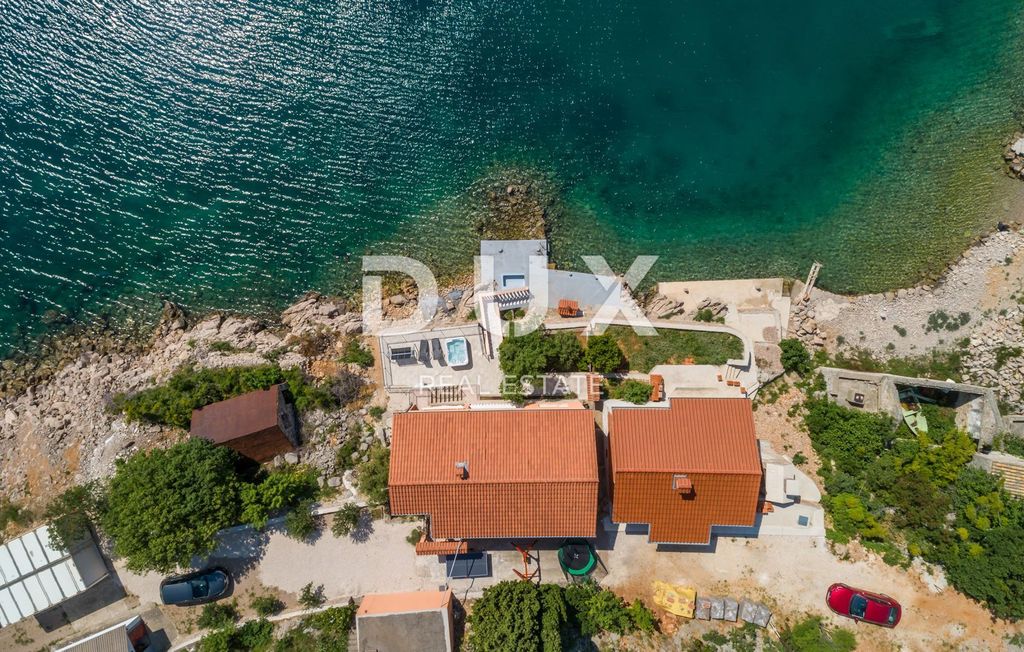 This beautiful house is located at the foot of Velebit, right next to the sea. The house has two residential units, each on its own floor. On the ground floor there are two bedrooms, a storage room, a bathroom, a kitchen with a dining room and a living room that leads to a large terrace with a panoramic view of the sea. On the first floor, there is a second apartment with three bedrooms, a bathroom, a kitchen and a living room with access to a balcony with a wonderful view of the sea and the islands. The surroundings of the building are nicely decorated, on it there is another terrace where there is a jacuzzi, from the terrace there is a path down to the sea and the landscaped beach where there is a small children's pool and barbecue. One air conditioner takes care of heating on the ground floor, while on the first floor there are two air conditioners, a fireplace and an electric heating stove. Electricity and water installations were changed in 2022. There is room for a smaller pool in the garden. This is an ideal facility for people seeking peace and solitude. In addition to the house, an old house of 30 m2 on 200 m2 is also for sale, also 1st row to the sea.