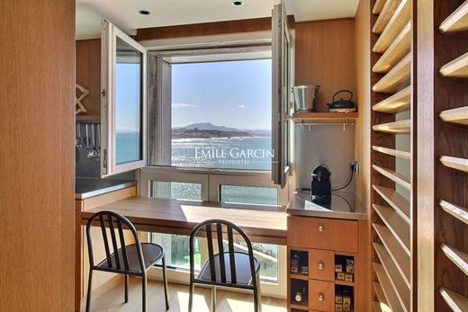 An extremely rare opportunity. Located on the top floor (Level 4) of the celebrated Villa Belza, this apartment offers a panoramic view of the oceanfront and mountains from each of its rooms. The renovation of this apartment has lent it a chic, sober nautical spirit that blends harmoniously with its ocean backdrop. The living room backs onto a large terrace and the bedroom overlooks the ocean with a view of the Rocher de la Vierge. Unique.
