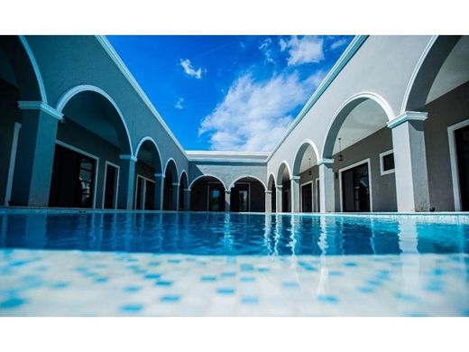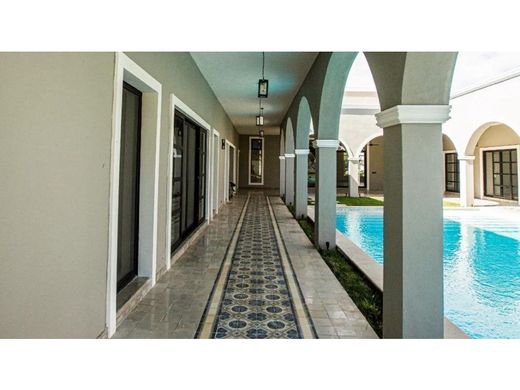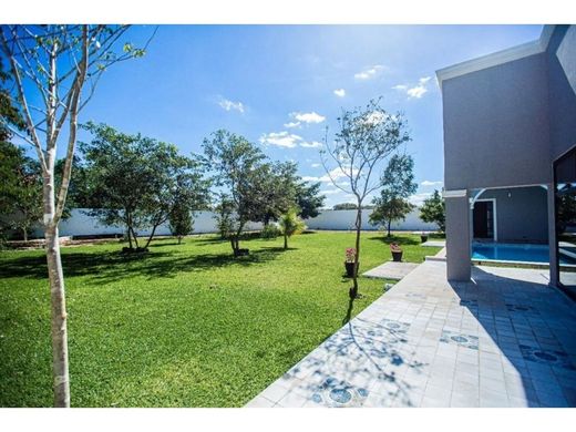 This beautiful and spacious residence manages to fuse Yucatecan architecture with modern touches of class and distinction, creating an atmosphere of tranquility and direct contact with nature, far from the hustle and bustle of the city. The property is located in the vicinity of Merida, in Sitpach, Yucatan, 15 minutes from the City Center and Plaza La Isla, and 20 minutes from Paseo Montejo. The house is located on a very large plot of land measuring 40 m wide by 80 m long with a construction area of approximately 1200 m². It has large wooded gardens which adorn and beautify this wonderful property, with paved access with stamped concrete, a double-leaf metal electric gate operated with remote control. Its high ceilings in the old Yucatecan style of 3.60 m high give it a natural freshness, but it is also fully air-conditioned and equipped with everything necessary for a modern and comfortable life. ARCHITECTURAL LAYOUT Main entrance with two-leaf steel gate operated by remote control. Motor lobby. Living-dining room of 14 m x 10 m and double height of 10 m with access to the distribution corridors, kitchen and access to the terrace and pool. Kitchen of 6.34 m x 7.70 m fully equipped with LUOVA kitchens and Silestone quartz countertops. Bar of 4.93 m x 6.90 m with front and rear bar with quartz coating, stainless steel sink and bathroom for women and men. Gym of 5.60 m x 6.20 m with contacts on the floor. Office measuring 4.50 m x 4.67 m TV room measuring 4.45 m x 4.70 m Multipurpose room measuring 9.90 m x 5.46 m Large terrace Infiniti-style pool measuring 16.63 m x 7.70 m, with Venetian tile finishes, filtering, filling and lighting system. Master suite measuring 5.95 m x 8.30 m, dressing room and full bathroom with whirlpool tub. Suite bedroom measuring 6 m x 8.25 m, dressing room and full bathroom. Junior suite bedroom measuring 5.95 m x 4.95 m, dressing room and full bathroom. Three guest bedrooms with large wooden wardrobes and full bathroom each. Laundry and drying room with shelves and storage closet Service room with full bathroom Pump room Cellar Covered garage for 4 cars under roof and two more uncovered. Huge garden with American grass and various trees and plants. EQUIPMENT Inverter minisplit air conditioning equipment and ceiling fans. 350 MB fiber optic Internet installed by TELMEX. Drinking water stored in an 8,000 liter cistern. 7 Rotoplas water tanks of 1,100 liters each distributed throughout the house. Two GENERAC GUARDIN series emergency generators, 26 KW 110/220, 200 AMP LP gas, with its respective stationary tank each and protected by a concrete shed. Two solar panel systems; the first with 18 panels and the second with 8 panels installed and inverter, Two stationary gas tanks of 300 liters each. Three gas-powered water heaters. Video intercom Automated irrigation system 6-burner gas grill Electric grill Double-door refrigerator freezer Gas wall oven Electric oven Electric dishwasher Food waste disposer 32-bottle wine cooler Hydro pressurizer Water filtration system for the pool DELIVERY DATE Immediate PAYMENT METHOD Own Resources and Bank Credit Amenities Exterior Cistern Covered parking Garden Grill Patio Sprinkler irrigation Terrace Water view
