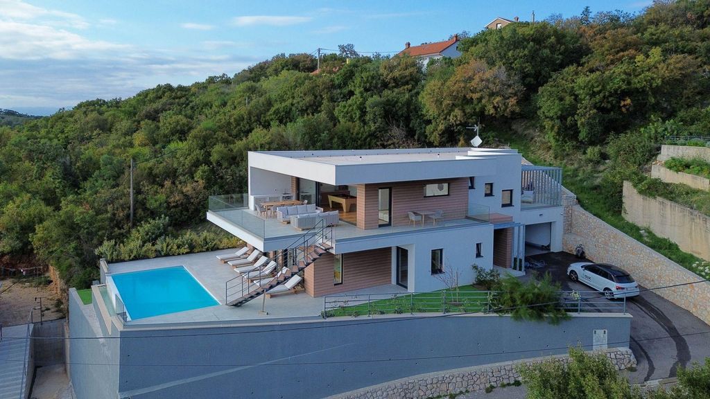 We are pleased to present this exquisite villa located in Hreljin, near Rijeka, featuring a direct and almost panoramic view of the sea! The villa is complete and ready for its future owners. It boasts excellent quality construction, designer furnishings, an infinity pool, and top-notch amenities from brands like Daikin and Miele. Additional features include a sauna, jacuzzi, billiards room, and a stylish lounge area with incredible details, along with spacious terraces for relaxation.