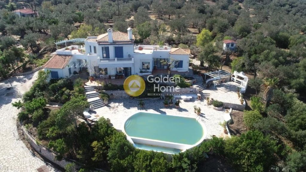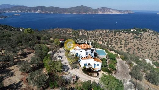 Excellent detached house, built on a hill, near Galatas. Its unlimited amphitheater view of Hydra, Poros and the endless blue makes it ideal for beautiful family holidays!! It is located in a green estate of 4362 sq.m., with olive, orange, lemon and mulberry trees and pines, as well as drilling.