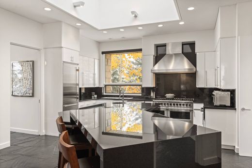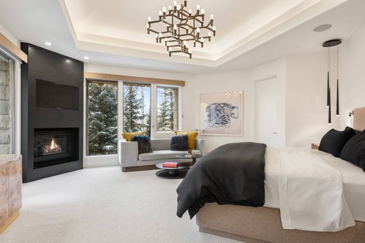 This fully renovated (2021) contemporary ski home, located directly on the Dawdler green run, offers seamless ski-in/ski-out access, making it an ideal choice for a holiday rental. The 4-bedroom, 4-full bath, and 2-half bath residence features ensuite bedrooms, three with steam showers, ensuring privacy and relaxation. High-end finishes are showcased throughout, including radiant-heated polished black slate floors, Italian chandeliers, and a gourmet kitchen with Viking appliances, an 8-burner gas range, dual dishwashers, SubZero refrigerators, and a wine cooler—perfect for entertaining. The great room, with its grand gas fireplace and dedicated bar, provides an incredible gathering space, while heated south-facing patios and a snow-melted circular driveway add convenience. An elevator from the garage to the main level and a spacious ski room with direct access to the owner's trail elevate this property's luxurious appeal, creating an unforgettable alpine experience.