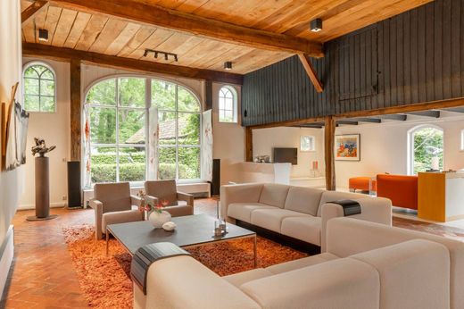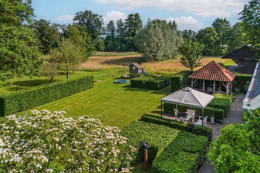 From the Hasseltweg, visitors are guided via the oak-lined driveway to this beautiful farmyard. There is ample space to park several cars. The house is surrounded by a green oasis of various hedges and partitions, all laid out based on a design by internationally renowned landscape architect Piet Oudolf. He transformed the wide, fan-shaped plot into a true paradise. There are multiple sitting areas, each separated with its own privacy and character. At any time of day, it is here for more than optimal enjoyment. The garden is intersected by a small ditch, creating a beautiful natural division: around the house is a landscaped area while the other side of the ditch is a nature meadow with various fruit trees (apple, pear, plum, and a lovely chestnut tree) and a pond where a family of deer raises their young in the tall grass every year. On a separate section of the property are 28 solar panels. The rear boundary is entirely natural with a few solitary trees or evergreen shrubs, allowing full enjoyment of the expansive views and a stunning sunset every evening.