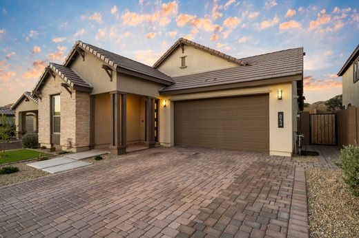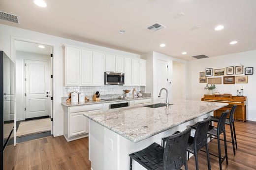 Discover this 4-bed, 3-bath home in family-friendly Aloravita, a newer community with parks, top-rated schools, and scenic hiking trails. Inside, enjoy a bright kitchen with granite counters, white cabinets, new backsplash (2022), oversized pantry, GE appliances, and a Samsung smart fridge. Luxury vinyl plank flooring (2022) adds style to the main areas. The spacious master suite offers a walk-in closet and private water closet. Custom sconces light the foyer and living room. Checkerboard tile upgrades (2022) add charm. Outside, enjoy a covered patio, turf yard (2022), fire-pit, bistro lights, and extended privacy wall—perfect for kids and entertaining.