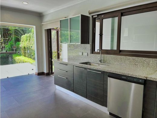 House in Condominium in Escazú Rent: $ 3,800 with Appliances Lot: 466 m2 Distribution: Three levels Construction: 386 m2 4 bedrooms 3.5 Bathrooms First level: Living room, dining room, separate kitchen, half guest bathroom, nice view, laundry room and service room and bathroom. Second Level: Master bedroom with air conditioning, walking closet and full bathroom with double sinks 2 secondary bedrooms that share a full bathroom An office Basement Level: Multipurpose room, bar area, garden, large terrace, jacuzzi large room with full bathroom 3 parking spaces It has no common areas 24/7 Security