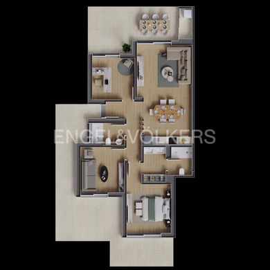 The corridor leading to the sleeping area has a bathroom with shower, a spacious master suite and 2 offices/bedrooms, each of them boasting large windows giving an exceptional luminosity and direct access to the terraces totalling 60,25m².