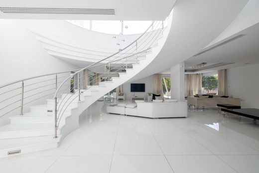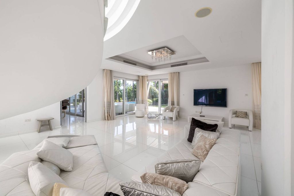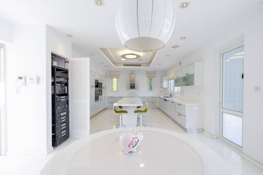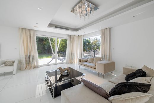 This luxury villa is located near Parklane Hotel in Limassol, just a short walk from the sandy beach. Nestled within a small gated complex of five detached villas, it offers prime access to the sea and proximity to upscale restaurants, shops, and entertainment centres. The expansive three-level house is perfect for living and entertaining. An elegant foyer opens to a spacious open-plan living and dining room with access to a covered veranda. The living room features large windows that fill the space with natural light and provide peaceful garden views. The kitchen, fully equipped with high-end appliances, adjoins a cozy family room complete with a fireplace. Accessed via a lift or luxurious staircase, the first floor hosts four spacious bedrooms, each with its own en-suite bathroom. The master suite includes an opulent en-suite bathroom, dressing room, and private sea view balcony. The ground floor offers a gym, massage room, sauna, cinema room, auxiliary kitchen, laundry, and pantry. Guests or staff can utilize a separate guest house. The property includes parking for two cars, a beautifully landscaped garden with a private swimming pool, and a covered barbecue area.
