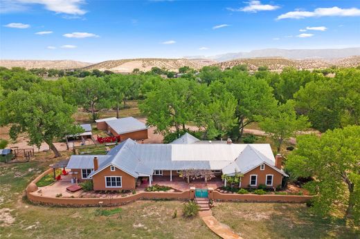 Enjoy gracious living along the tranquil banks of the Chama River with incredible views of the enchanting Abiquiu landscape of colorful canyons and mountains so often painted by Georgia O’Keeffe. This inviting home, shaded by majestic cottonwoods, is well-sited on 20 acres of fertile pastureland and vineyards. The well-designed, Northern New Mexico style main home features vaulted ceilings, beams, wood decking, vigas, brick floors, multiple fireplaces, hand-carved wooden doors, spacious living areas and an open chef’ s kitchen. An isolated primary bedroom suite with ensuite bath and attached light-filled study opens out to a courtyard patio and offers privacy and plenty of space. The other bedrooms each have their own bathrooms and access to outdoor areas for solitude. A modern, fully equipped casita with outdoor areas is perfect for guests. Outdoor living is enhanced by covered flagstone portals, seating areas, rock, and stucco courtyard walls, horno oven, grill, jacuzzi spa, tree-lined pond, a fire pit where the current owners have enjoyed annual oyster roasts, and a private bridge across a fork in the river. Outbuildings include a large, lofted barn, corals, chicken coop and livestock pens. The fenced property benefits from two private wells and water ditch rights. This home is the perfect haven for enjoyment of countless outdoor activities including hiking, kayaking, fishing, hunting and horseback riding. Nearby attractions include Plaza Blanca, Monastery in the Desert, Ghost Ranch, O’Keefe Home, and studio, Abiquiu Lake and Echo Amphitheater.