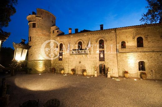 The interiors consist of seven suites-double bedrooms with the possibility of a third bed, each with large bathrooms or salle de bain equipped with the latest technology such as whirlpool tubs and showers with aroma-therapy, chromo-therapy, ozone-therapy, Turkish bath and radio. The suites are named Contessa, Dama Bianca, Borgia, Gotica, Vergini, Torre degli Sposi, Cavaliere. The master apartments arranged on two floors, have 4 double bedrooms with the possibility of a third bed (each with an independent bathroom equipped as above) called the Master Bedroom, Bishop's Room, Guest Room, Lady's Apartment. In the Longobard Tower are arranged on 4 levels other double rooms named Swan Bedroom, Lion Bedroom, Raven Bedroom and Templar Bedroom connected by a helical staircase. On the first level of the Longobard Tower are located 2 equipped bathrooms. In the Foresteria del Castello there are two rooms (one double and one single) with equipped bathrooms also for handicap use. In total, there are eighteen bathrooms considering the service one for the Museum Area (called the Grottino), the service one for the Dining Room, the one called the Pensile dello Studiolo located in the Padronali apartments and the service one adjacent to the Salone dei Cavalieri. The Property has three fully equipped kitchens: the Old Castle Kitchen (on the ground floor), the Mistress Kitchen (on the second floor of the Mistress apartments), the kitchen of the small apartment of the Lady of the Company (on the second floor of the Mistress apartments) On the ground floor there are numerous halls and reception rooms, including large ones such as the Great Hall of the Armigers (over 100 sq. m., the largest in the Castle), the Ancient Captains' Refectory, the Great Entrance to the Borgo and Renaissance Staircase, the Neo-Gothic Painted Hall, the Guard Room, the Hall of Arms, the Passage Room and Grottino, the Ancient Gallery and main entrance to the Castle, the Gallery and Collections Room, the Entrance Hall to the Park with the underlying Medieval underground passages leading to the Old Medieval Cistern that still exists, the Grand Renaissance Dining Room, the Old Castle Kitchen and the Old Chapel. Connected to the Great Castle Kitchen, a large enclosable porch with stained-glass windows leads to the two covered cloister rooms, which in turn connect with the Longobard Tower and its aforementioned rooms. A wide stone staircase leads to the Castle's Piano Nobile and the Countess, Borgia, Dama Bianca, Gothic and Virgin suites. From the Contessa and Borgia suites there is access to a large square panoramic terrace overlooking the Castle's Old Cloister and inner courtyard. From the Longobard tower there is external access to the great outer Esplanades of the Castle above the portico. From these a bold staircase carved into the stone puts one at the uncovered top of the Longobard Tower itself, which serves as a solarium. Also located on the Piano Nobile are the Golden Room, the Ancient Library, the Office and the Renaissance Room from which it is possible to enter the Castle's main Torre degli Sposi-Mastio divided into three levels: La Salle de Bain (fully frescoed), the Bridal Parlor and the aforementioned Torre degli Sposi suite. It is noteworthy how the entire Piano Nobile of the Castle of Castelleone, including the various connecting corridors, presents integrally wall and ceiling decorations in both tempera and fresco with geometric floral motifs, naturalistic motifs, gallant scenes, feudal military scenes, etc., always different in each room. From the Piano Nobile one enters the mentioned Knight's Hall and the Great Knights' Hall also entirely decorated in tempera on both ceiling and walls. From the latter large reception room an external covered staircase puts to the covered summit part of the Belvedere Tower from which there is a 360-degree panorama.