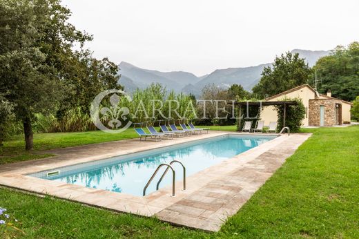 Wonderful Villa of about 340 sqm in the hills of Camaiore, with private pool set in the stones, surrounded by large garden and private land of about 10000 sqm with olive grove and fruit trees, a short walk from the town center and a few minutes from the sandy beaches of Versilia. This beautiful Villa offers all the comforts and total privacy, immersed in an evocative setting with views of the Apuan mountains, the fusion of ancient and modern makes it unique and welcoming, with large openings and plays of light that enhance every little detail, from the modern iron bookcase to the warm hearth, around which the living area and the kitchen are developed.