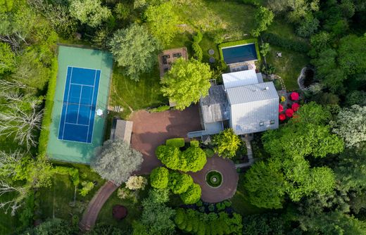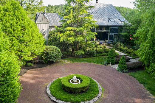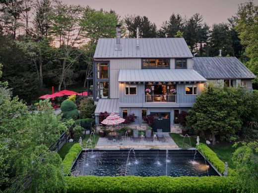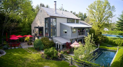 This stunning barn conversion seamlessly blends rustic charm with modern luxury. The barn and farmhouse date back to 1710. The character of the original barn has been carefully preserved featuring the original exposed beams and magnificent stonework. Upon entering the home, you are greeted by a spacious open and flexible living area with soaring ceilings and large windows that flood the space with natural light. There are also radiant heated hard wood floors throughout this level. This designer decorated home is available fully furnished. A beautiful bright gourmet kitchen boasts high end appliances, a large center island and lots of counter space and custom cabinetry. The living room is spectacular with a magnificent Rumsford fireplace at its center. There is also a large dining area surrounded by windows overlooking the gardens. This floor also has a well-sized office and a full bath. The stone walls, wood beams and radiant heated floors continue to the lower level featuring an amazing primary suite which includes a large bedroom, gorgeous marble bathroom with mother of pearl mosaic floors, glass shower and soaking tub. A dressing hall features rows of closets and there is a sitting/dressing room with beautiful lit cabinetry. A balcony works perfectly as a home gym overlooking a sunroom and double doors out to the pool and gardens. The second floor includes 2 guest suites and a full bath. The third floor has an interesting, cozy space for either an additional bedroom or home office. The home also includes a completely private one-bedroom guest apartment with a full kitchen, living room and deck overlooking the gardens. The apartment is accessible from either inside the home or through its own private entrance with an elevator. Step outside to discover the extensive lush gardens and mature trees, creating a peaceful escape. The expansive Blue Stone terrace with outdoor kitchen is ideal for seasonal al fresco dining while overlooking the swimming pool complete with eight fountain heads. There is also a koi pond with waterfall and magnificent illuminated gardens. A tennis/pickle ball court completes the outdoor amenities. The home is conveniently located with a wide variety of shopping and dining options minutes away. Drive time to Princeton is 20 minutes, 40 minutes to Philadelphia and 70 minutes to NYC while the nearest train station is a 20-minute drive. Behind the gated entrance, Eight Bells is truly a private oasis located in one of Bucks County’s most prestigious/upscale towns. A perfect getaway retreat, this property promises a lifestyle of elegance and tranquility.