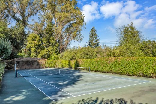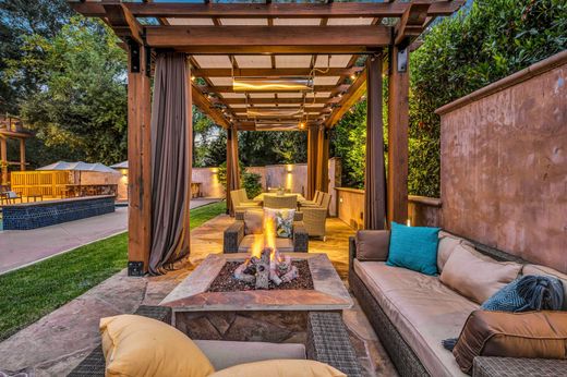 This property is located in a comfortable four-home gated community set back from Brush Creek Road behind an impressive, custom-made wrought iron shared community gate. The property is beautifully landscaped with a long private driveway, ample parking, a three-car garage, an entertainer’s resort-style pool, spa, and outdoor barbecue area. It also features a tennis court, a fruit orchard with a meandering trail, all set on 1.36± awe-inspiring acres. This spectacular home was built in 2000 and designed by Farrel and Faber, a renowned local high-end architectural and design firm. It features luxurious amenities, including four large bedrooms, five full bathrooms, a home dry sauna spa room, and an extraordinary wine cellar. With 4,926± square feet of gracious living space, almost every room boasts panoramic Rincon Valley views, all adorned with hardwood and travertine tiled floors. The grand entryway features a 14-foot ceiling, leading to a beautiful formal dining room, an elegant living room with a fireplace and more views, and a spacious family room with a dramatic marble tile fireplace and a custom sound system throughout the entire home, including in the wine cellar. The majestic backyard offers breathtaking views, an inground pool, a spa, and a well-appointed tennis court with a tennis hut that includes a bathroom and storage room. The orchard is full of mature trees, including olive and citrus trees, along with dozens of rose bushes. This home has so much to offer, all tastefully finished in an impressive and elegant way!