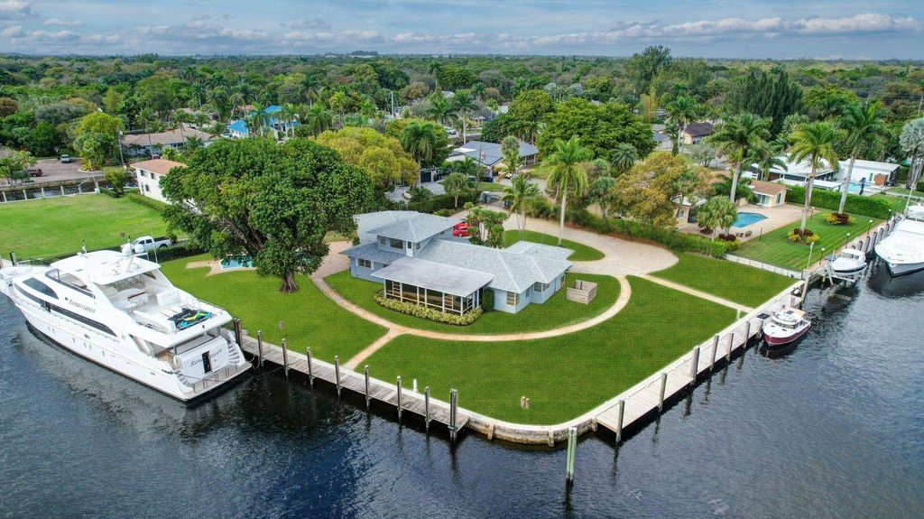 Valuable & rare point property under $4mm! Located in an idyllic & unique park-like setting opposite Secret Woods nature reserve & offering serene wide views on South Fork New River. Unusually large, .72 of an acre & perfect for large or multiple yachts, approx 344' of deepwater dockage, 191' on the river & 153' on side canal, approx 7.5 ft low tide depth. Residence is light & bright. New roof 2021. Offers expansive great room, dining area, kitchen & split bedroom plan 2 first level bedroom suites, upstairs primary & great views. In addition to 2-car garage there is a totally private Captain's quarters or guest suite. Enjoy as-is, renovate or tear down. Down River Estate is fenced & gated for privacy & security, vaste circular driveway, expansive green areas, established trees & large pool Property Details (as per seller) - Air conditioners replaced 2018 and 2022. Electrical main box and dock power 2009. Power on side canal dock 100 amp 220 v and river dock 100 amp 220v and 2 x 50 am 220 v. Side canal width is approximately 100 ft. Sprinkler pump and valves replaced 2024. New gate motor & computer panel 2023. Dredged in 2015 Seawall maintenance 2015. New garage ceiling with tongue and grove in 2024. Garage doors installed in 2024. Septic tank approx 2 years old.
