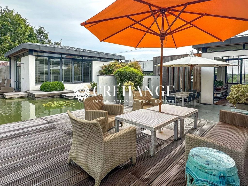 Large sliding glass doors extend the living room onto a terrace, creating a seamless connection to the garden and offering a panoramic, unobstructed view of Paris.