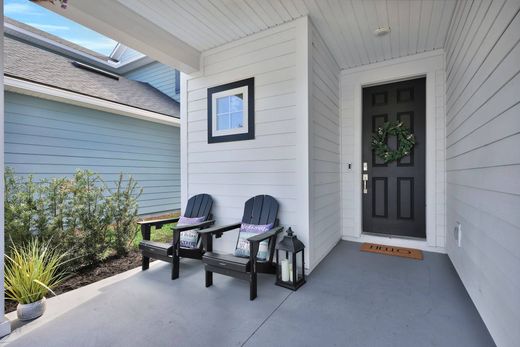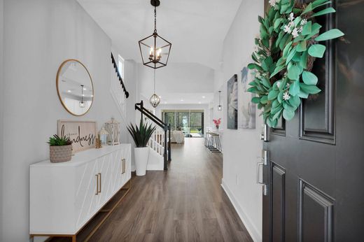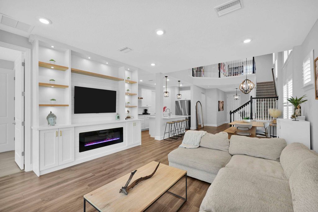 Welcome to this stunning two year old David Weekley McClanahan model, nestled in the highly sought after Settler's Landing in Nocatee! This meticulously maintained home offers four bedrooms, two and a half baths, and a wealth of custom features that make it truly one of a kind. Step inside to discover a spacious open floor plan with beautiful plantation shutters, a custom built living room with a cozy fireplace, and plenty of built ins for added storage and style. The gourmet kitchen is a chef's dream, perfect for entertaining and everyday living. The oversized, extended screened in lanai with pavers offers the ideal spot to relax while overlooking a peaceful preserve, one of the largest backyards in Settler's Landing, with tons of room for a pool! The master bedroom is conveniently located downstairs, offering a private retreat, while upstairs you'll find three additional bedrooms plus a versatile flex/playroom. Each bedroom comes with custom closets, ensuring ample storage for all your needs. Additional highlights include a finished attic space with a pull down ladder, custom closets throughout, a two and a half car garage with overhead storage and golf cart parking, and dual electric outlets in the garage, one for your golf cart and another for an electric vehicle. Location is key, and this home is just minutes from the PIA school, playground, dog park, walking path, and Settler's breathtaking pond. It's perfect for bike rides, jogs, or simply enjoying the serene surroundings. This incredible home offers the best of Nocatee living. Luxury, comfort, and convenience all in one.