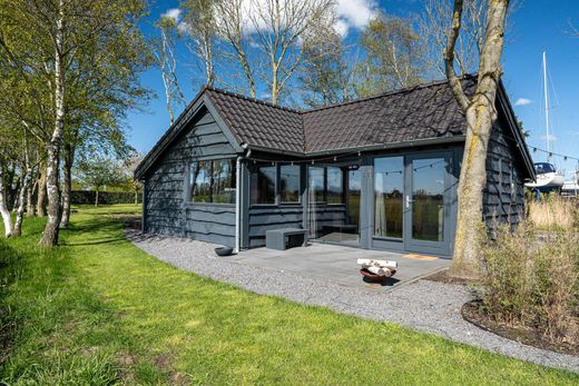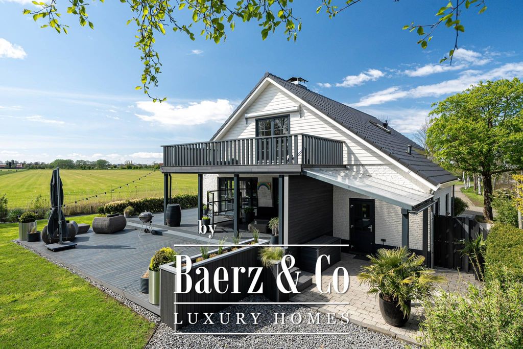 In a prime location near the IJsselmeer, adjacent to a marina with direct access to all waterways in Friesland, this villa was completely renovated in 2004 and is situated on a spacious, fenced plot with full privacy and stunning Frisian panoramas. The tranquility, greenery, water, ever-changing skies, and sense of freedom are the defining features of this home. This well-insulated villa of 245m² is designed for lifelong living, featuring a spacious living area, four bedrooms, two bathrooms, a luxurious kitchen with utility room, and a beautiful veranda with scenic views. The double garage with an upper floor offers an abundance of space and possibilities. The fully insulated home office, studio, or guesthouse with breathtaking views of nature serves as a true source of inspiration. The architecturally designed garden, maintained with a robotic lawn mower, is easy to care for and playfully arranged with various fruit trees, hedges, and reed-lined waterways. The stylishly paved driveway and entrance gate highlight the transition to the lush green garden that remains vibrant year-round.