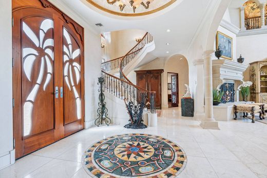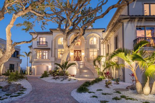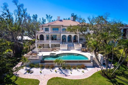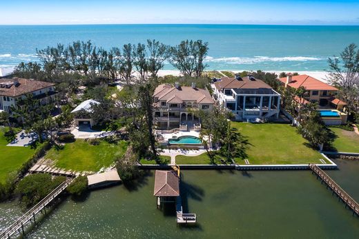 This classically designed estate is privately positioned on north end of Casey Key, considered among the most treasured addresses in Sarasota County. The property spans from a sandy walking beach on the Gulf to a rare covered boat dock on Blackburn Bay. Designed by renowned architect Clifford A. Scholz and built by Delta Southern Construction, over 8,000 square feet designed to celebrate family and guests, this is a residence that inspire togetherness and embodies the art of waterfront living. Crafted with luxury finishes and modern conveniences, the property is built to exacting coastal standards with dramatic focus on stunning water views. Formal and casual spaces unite elegantly, including the living room with cypress beamed ceilings, overlooking the bay. A deluxe kitchen, wine, butler's pantry and wet bar provide a canvas for culinary exploration and entertaining elegance. A grand media room for screening films provides the ideal place to unite music and culture. The expansive primary bedroom features a sitting room, lavish bath, dual closets, a breakfast nook and expansive views over the water. Three additional bedroom suites provide privacy, views and spacious accommodations. The fifth bedroom suite is equipped for a home gym, steam room and sauna. The office and library, next to the grand marble staircase, features leaded glass doors, hand crafted, built-in shelving, a coffered ceiling and beautiful views of the Gulf. Additional space for recreation and relaxation has been accomplished to make use of every inch of the estate. Arched hallways and French doors line the living room, open to the dazzling outdoor spaces and stone terraces lead to the infinity pool. Elevator access and garages for six vehicles add ultimate convenience. Enjoy boating from the deep-water dock which features a rare and grandfathered-in covered boat lift. North Casey Key is a haven of exclusivity and serenity, minutes from shopping, world-class golf, tennis and dining.