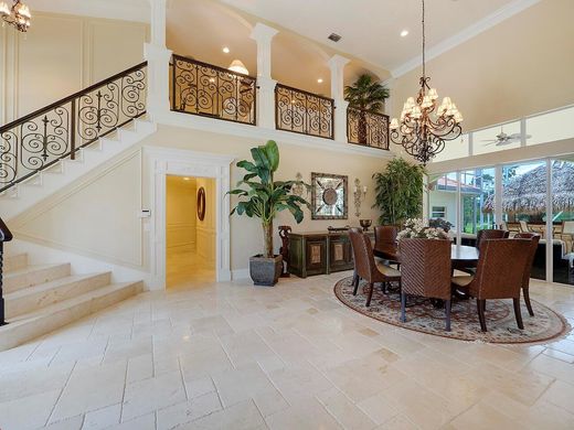 Estate home located in the prestigious community of PGA Village. Found in the Sabal Creek subdivision, this 2 story Mediterranean is situated on 1.7 acres. Property has a main house and an attached guest house, 3 car garage and large circular drive. Entire residence impeccably finished. French Cut Crema Marfil Marble flooring throughout, custom trim, crown molding, plantation shutters, 4000 SF main living quarters consist of 5BD and 3BA. Dramatic 2 story formal living room. Large dining room. Family room opens to a true chef's kitchen. State of the art appliances, custom cabinetry and a 6'x12' granite island. Adjoining Guest house complete with full kitchen, living room, 2BD and full BA. Large Screened Pool area with Tiki bar and covered Loggia. Grand home. Premier community. Paradise.