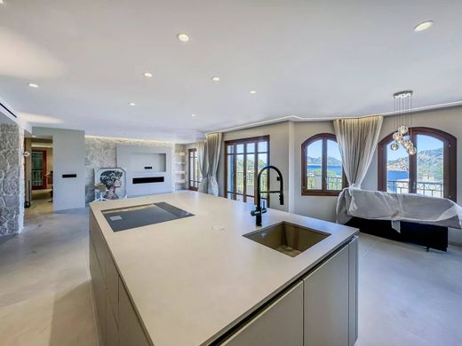 The open concept kitchen is a masterpiece of contemporary design, complete with a sleek kitchen island and state of the art appliances. Flowing effortlessly into the spacious living area, the ambiance is elevated by an elegant electric fireplace and floor-to-ceiling windows that frame mesmerising views of the Mediterranean and the picturesque island of Dragonera. From here, sliding glass doors lead onto the expansive terrace, a perfect retreat to soak in the tranquil surroundings.