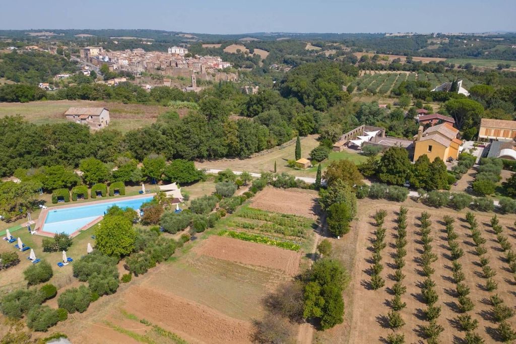 From the cloister and the rooms you can see the fortified town of Gallese, with the turreted walls surrounding the tuff buildings divided by narrow paved streets, among which the Duomo and the Palazzo Ducale stand out. Everything integrates perfectly with the natural landscape of the Tiber Valley, creating an evocative atmosphere rich in history. Every corner of the property tells of the beauty of the countryside, the richness of its fruits: the two hundred olive trees arranged in rows, the 1,200 m2 vegetable garden and the lush garden surrounding the buildings and the swimming pool with adjoining changing rooms and bathrooms.