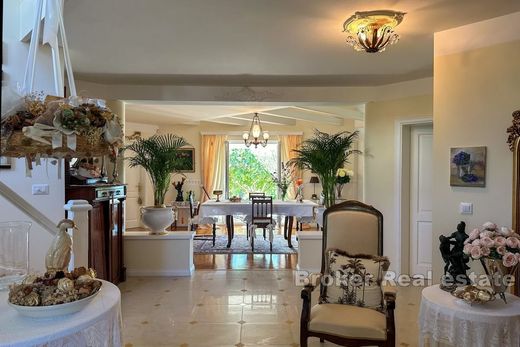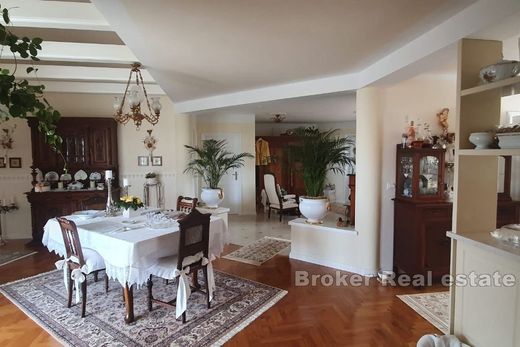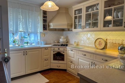 A beautiful charming family house for sale located near Poreč, in a quiet location surrounded by greenery and nature. The total living area is 265 m2 and extends over two floors. The ground floor consists of an airy entrance hall that includes a space for shoes. Next to the entrance hall there is a toilet and a technical room. The main part of the ground floor has been thoughtfully designed to offer comfort and functionality. The fully equipped kitchen, along with the pantry opens to the dining room, creating the perfect space for family meals and entertaining guests. A cozy living room with a fireplace extends to the covered terrace, providing a flawless indoor and outdoor living experience. In addition, there is a bedroom with its own bathroom on the ground floor, ensuring privacy and comfort. An internal staircase leads to the first floor, which consists of two bedrooms and a shared bathroom. The charming loggia offers an outdoor retreat, ideal for relaxing and enjoying the view. The yard is meticulously landscaped as a green garden, decorated with olive trees, lively flowers and a peaceful pond with a fountain. The lush lawn is equipped with an automatic irrigation system that ensures year-round greenery. The property also has a summer kitchen with a storage room of approx. 20 m2, suitable for cooking and outdoor gatherings. An additional storage room for tools is provided on the plot, and there is also a building permit for the extension of the swimming pool. The property offers a peaceful retreat from the hustle and bustle of everyday life, and at the same time is conveniently close to all essential amenities.