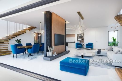 A beautiful modern villa under construction in an attractive location. It is characterized by a modern design, authentic stone parts and wooden elements, which makes it a perfect combination of style and functionality. The total living area is 306 m2. It consists of a large living room that turns into a luxurious open space that connects to the dining room, kitchen and billiard room. This spacious space allows for free movement, making it an ideal place to entertain and relax with friends and family. A double staircase leads to the first floor. On the first floor there is a wellness room with a Finnish sauna equipped with a shower and a toilet, and four bedrooms with separate bathrooms. Openings in the roof allow a view of the starry night sky, creating a special atmosphere and a special experience. The infinity pool creates the illusion of merging the water with the sky or the sea in the distance. The villa is equipped with a top floor heating and cooling system using a heat pump and fan convector to ensure comfort all year round. There are 4 parking spaces next to the property, ensuring enough space for your vehicles. This luxury villa in the idyllic western part of Istria offers an ideal refuge from the hectic everyday life, while at the same time offering a harmony of luxury and a relaxed environment for relaxation and enjoyment.