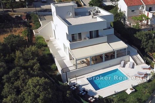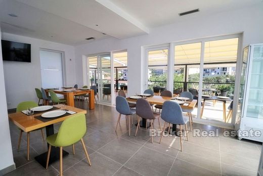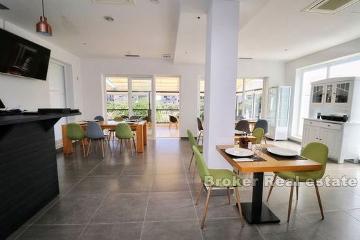 For sale is a house with a restaurant with a living area of 340 m2, located on a plot of land of 933 m2, located in a prime position. The property was built in 2019/2020. The property is located on the northern side of the island of Čiovo, only 100 m from the town center and beautiful beaches. The house consists of 2 floors. The ground floor consists of a restaurant with a kitchen and a large terrace with access to the pool. On the second floor there is a lobby with a reception and 3 apartments, each of which consists of a room, a bathroom and a balcony with a view of the sea. The property has 20 parking spaces for the needs of restaurant and apartment guests. Considering the current condition and development potential of the place where it is located, this property represents a quality investment.