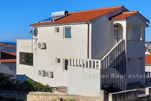 Apartment house with sea view on three floors. The ground floor consists of three apartments, each with a separate entrance, but the space can be converted into one large apartment. The former garage has also been converted into an additional apartment. On the first floor is an apartment with a large covered terrace, while on the second floor is an apartment with an uncovered terrace. The house has easy access and parking. The house is located in the center of a small Dalmatian town by the sea, where you can enjoy the beautiful view. It is built of the highest quality materials, stairs and railings are made of marble and the floors are resonantly and thermally insulated.