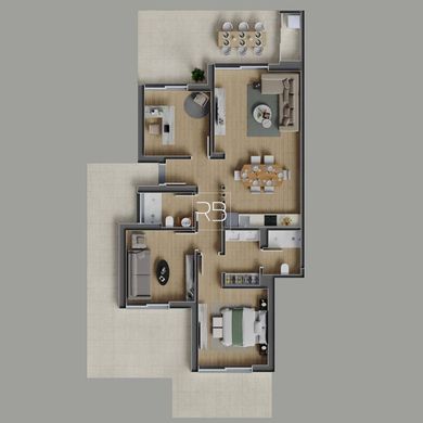 This magnificent apartment of contemporary architecture is located on the 1st floor of a building with only four apartments. It consists of a living room with an elegantly equipped open-plan kitchen, providing access to a pleasant balcony overlooking the resort. The master bedroom has a built-in wardrobe, en-suite bathroom and access to balconies. The other two rooms can be converted into a living room, bedroom or office, and are complemented by a further full bathroom with shower. The outdoor leisure area is easily accessible from any room in this comfortable apartment, through large windows that allow natural light to enter.